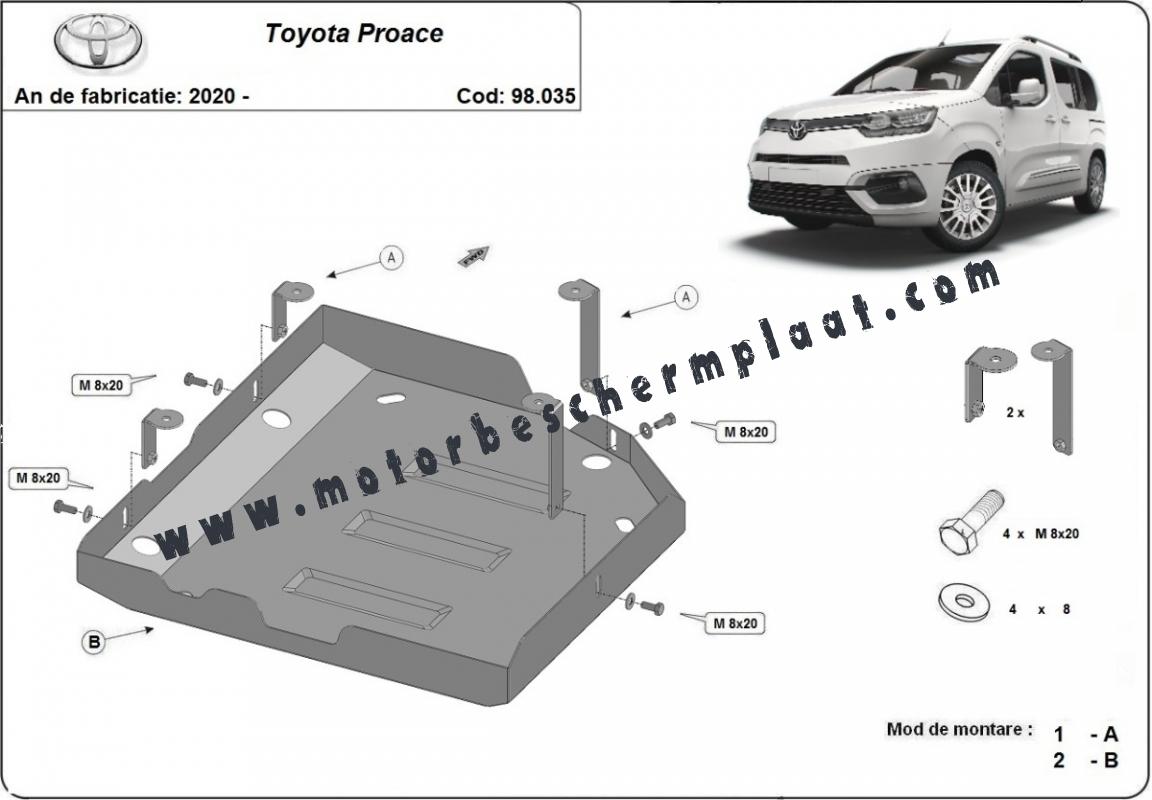 Voor de bescherming van: brandstoftank AdBlue De motor beschermplaat is nieuw en past perfect bij alle versies van Toyota Proace geproduceerd tussen 2020 en 2025. Gemaakt van 2 mm dikke Staalplaat. Schroeven, moeren, alle bevestigingsaccessoires zijn inbegrepen. Alle carterbeschermplaten zijn poedergecoat, om corrosie te vermijden. De buitenkant van de carterbeschermplaten heeft staalversterkingen, waardoor de weerstand tegen impact wordt verhoogd. |