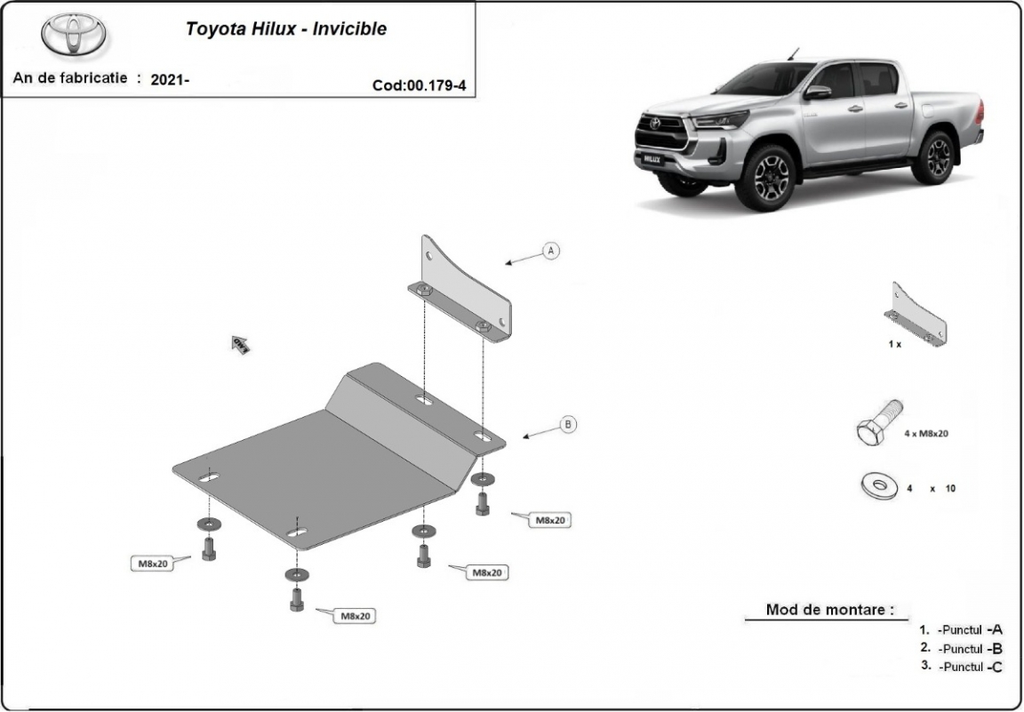 Voor de bescherming van: deeltjesfiltersensor De motor beschermplaat is nieuw en past perfect bij alle versies van Toyota Hilux geproduceerd tussen 2021 en 2026. Gemaakt van 2 mm dikke Staalplaat. Schroeven, moeren, alle bevestigingsaccessoires zijn inbegrepen. Alle carterbeschermplaten zijn poedergecoat, om corrosie te vermijden. De buitenkant van de carterbeschermplaten heeft staalversterkingen, waardoor de weerstand tegen impact wordt verhoogd. |