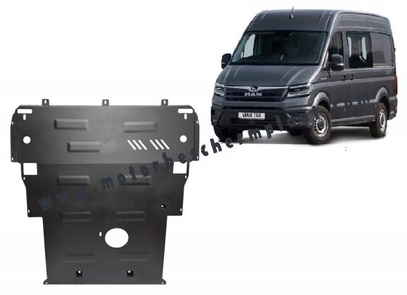 Beschermplaat voor de motor en versnellingsbak, bestemd voor Man-voertuigen. Het wordt gemonteerd zonder enige aanpassingen aan het voertuig, geleverd samen met alle vereiste montageaccessoires. Het heeft geen invloed op de garantie van het voertuig.