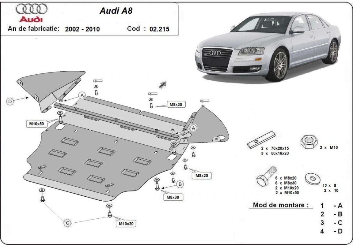 Voor de bescherming van: motor, versnellingsbak, radiator, voorbumper De motor beschermplaat is nieuw en past perfect bij alle versies van Audi A8 geproduceerd tussen 2002 en 2010. Gemaakt van 2 mm dikke Staalplaat. Schroeven, moeren, alle bevestigingsaccessoires zijn inbegrepen. Alle carterbeschermplaten zijn poedergecoat, om corrosie te vermijden. De buitenkant van de carterbeschermplaten heeft staalversterkingen, waardoor de weerstand tegen impact wordt verhoogd. |