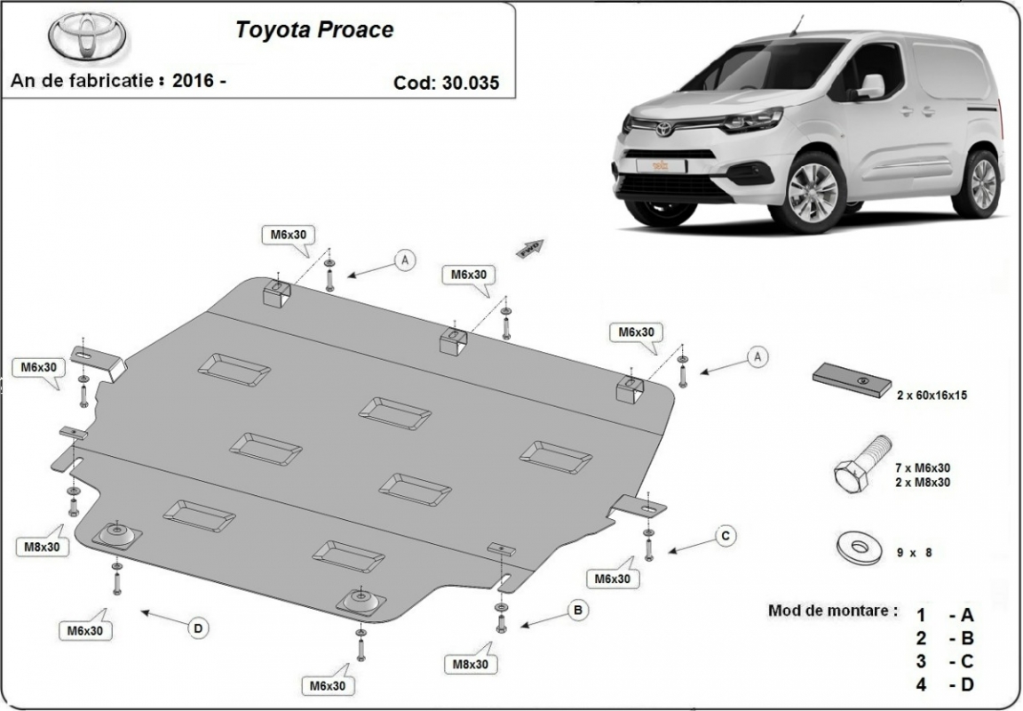 Voor de bescherming van: motor, versnellingsbak, radiator De motor beschermplaat is nieuw en past perfect bij alle versies van Toyota Proace geproduceerd tussen 2016 en 2026. Gemaakt van 2 mm dikke Staalplaat. Schroeven, moeren, alle bevestigingsaccessoires zijn inbegrepen. Alle carterbeschermplaten zijn poedergecoat, om corrosie te vermijden. De buitenkant van de carterbeschermplaten heeft staalversterkingen, waardoor de weerstand tegen impact wordt verhoogd. |