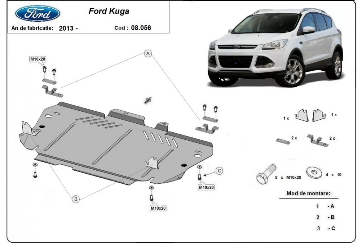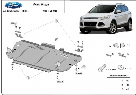 Voor de bescherming van: motor, versnellingsbak De motor beschermplaat is nieuw en past perfect bij alle versies van Ford Kuga geproduceerd tussen 2013 en 2019. Gemaakt van 2 mm dikke Staalplaat. Schroeven, moeren, alle bevestigingsaccessoires zijn inbegrepen. Alle carterbeschermplaten zijn poedergecoat, om corrosie te vermijden. De buitenkant van de carterbeschermplaten heeft staalversterkingen, waardoor de weerstand tegen impact wordt verhoogd. |