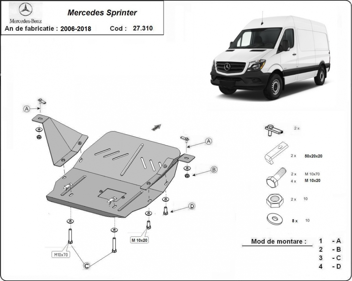 Voor de bescherming van: motor, versnellingsbak De motor beschermplaat is nieuw en past perfect bij alle versies van Mercedes Sprinter geproduceerd tussen 2006 en 2018. Het heeft een opening voor de oliecarter, dus hoeft het niet verwijderd worden bij olieverversing. Gemaakt van 3 mm dikke Staalplaat. Schroeven, moeren, alle bevestigingsaccessoires zijn inbegrepen. Alle carterbeschermplaten zijn poedergecoat, om corrosie te vermijden. De buitenkant van de carterbeschermplaten heeft staalversterkingen, waardoor de weerstand tegen impact wordt verhoogd. |