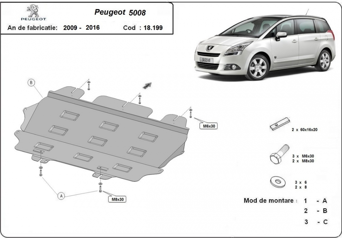 Voor de bescherming van: motor, versnellingsbak De motor beschermplaat is nieuw en past perfect bij alle versies van Peugeot 5008 geproduceerd tussen 2009 en 2017. Gemaakt van 2 mm dikke Staalplaat. Schroeven, moeren, alle bevestigingsaccessoires zijn inbegrepen. Alle carterbeschermplaten zijn poedergecoat, om corrosie te vermijden. De buitenkant van de carterbeschermplaten heeft staalversterkingen, waardoor de weerstand tegen impact wordt verhoogd. |