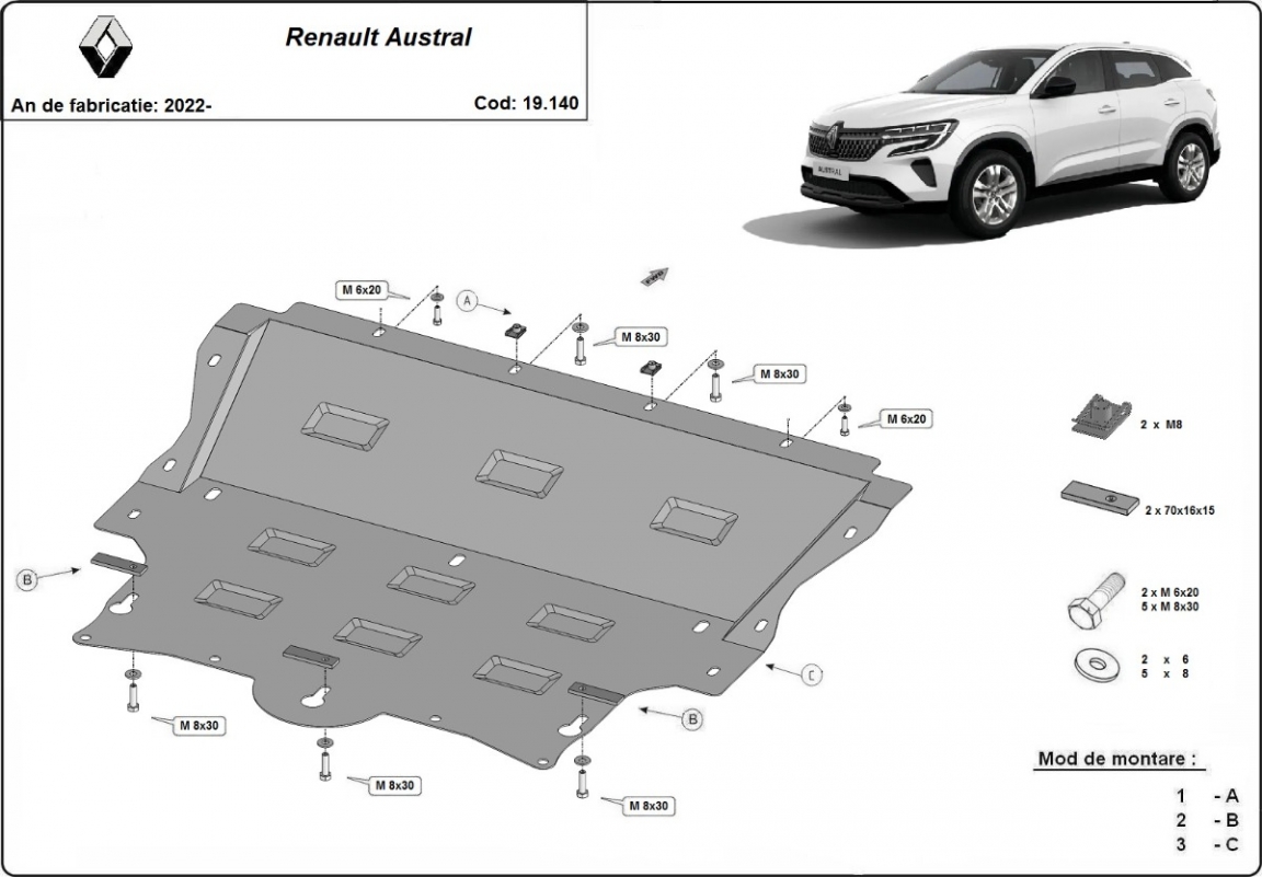Voor de bescherming van: motor, versnellingsbak, radiator De motor beschermplaat is nieuw en past perfect bij alle versies van Renault Austral geproduceerd tussen 2022 en 2026. Gemaakt van 2 mm dikke Staalplaat. Schroeven, moeren, alle bevestigingsaccessoires zijn inbegrepen. Alle carterbeschermplaten zijn poedergecoat, om corrosie te vermijden. De buitenkant van de carterbeschermplaten heeft staalversterkingen, waardoor de weerstand tegen impact wordt verhoogd. |