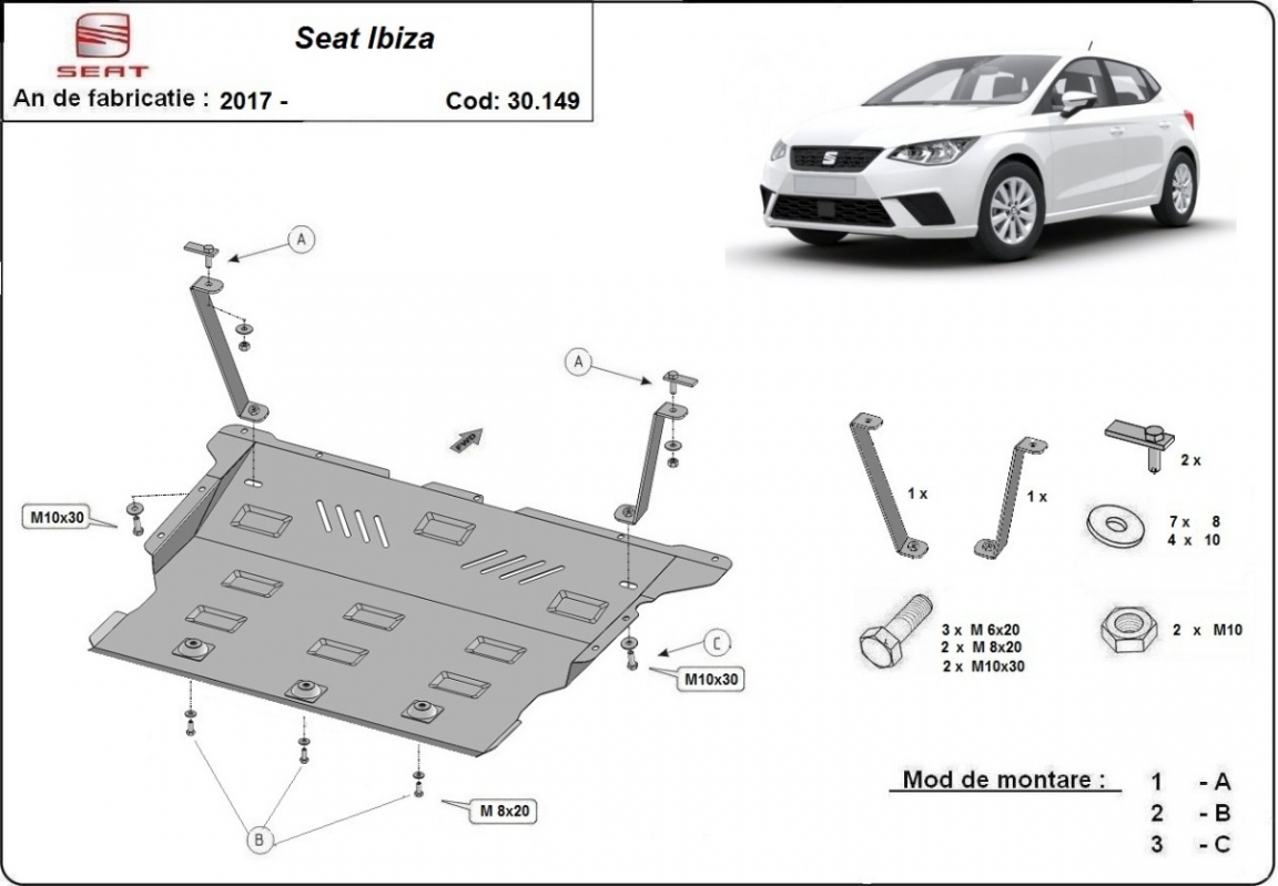 Voor de bescherming van: motor, versnellingsbak, radiator, voorbumper De motor beschermplaat is nieuw en past perfect bij alle versies van Seat Ibiza geproduceerd tussen 2017 en 2026. Gemaakt van 2 mm dikke Staalplaat. Schroeven, moeren, alle bevestigingsaccessoires zijn inbegrepen. Alle carterbeschermplaten zijn poedergecoat, om corrosie te vermijden. De buitenkant van de carterbeschermplaten heeft staalversterkingen, waardoor de weerstand tegen impact wordt verhoogd. |