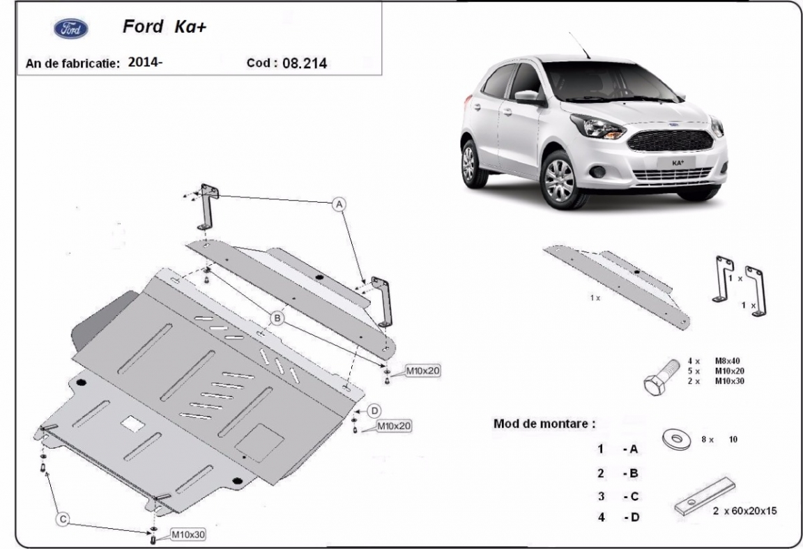 Voor de bescherming van: motor, versnellingsbak, radiator, voorbumper De motor beschermplaat is nieuw en past perfect bij alle versies van Ford KA geproduceerd tussen 2014 en 2020. Het heeft een opening voor de oliecarter, dus hoeft het niet verwijderd worden bij olieverversing. Gemaakt van 2 mm dikke Staalplaat. Schroeven, moeren, alle bevestigingsaccessoires zijn inbegrepen. Alle carterbeschermplaten zijn poedergecoat, om corrosie te vermijden. De buitenkant van de carterbeschermplaten heeft staalversterkingen, waardoor de weerstand tegen impact wordt verhoogd. |