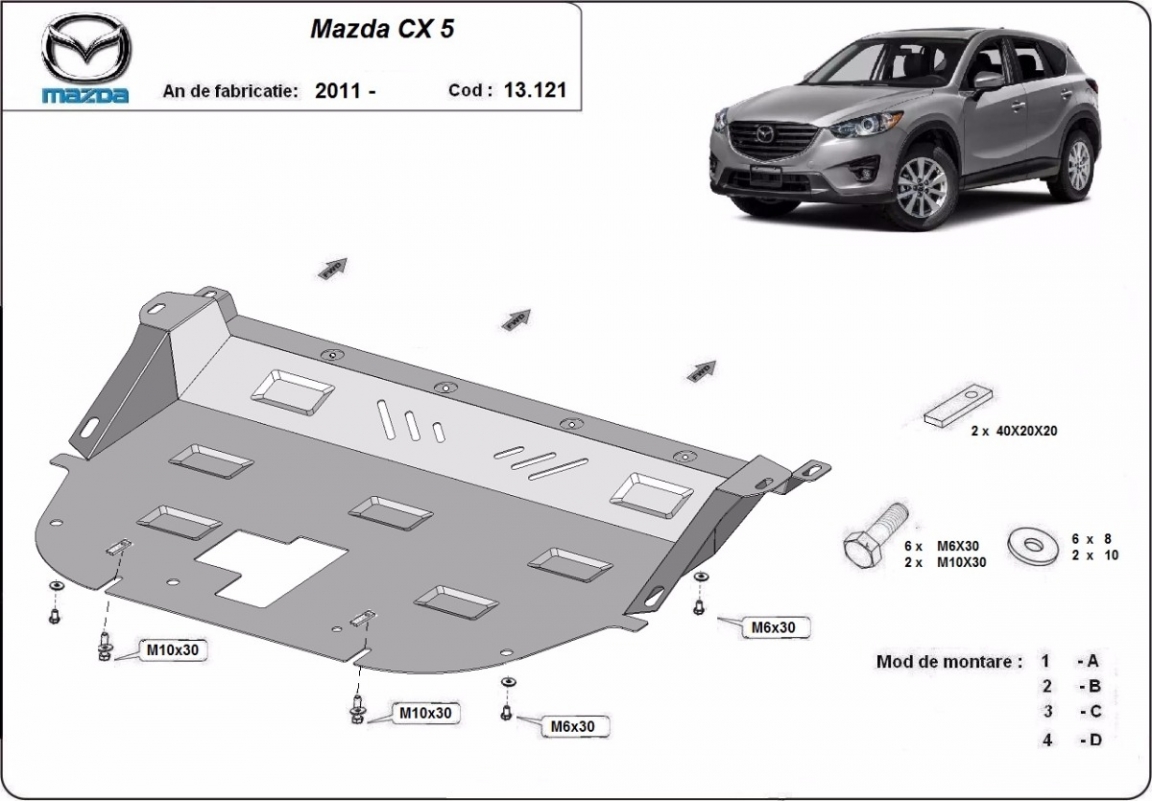 Voor de bescherming van: motor, versnellingsbak, radiator De motor beschermplaat is nieuw en past perfect bij alle versies van Mazda CX5 geproduceerd tussen 2011 en 2026. Gemaakt van 2 mm dikke Staalplaat. Schroeven, moeren, alle bevestigingsaccessoires zijn inbegrepen. Alle carterbeschermplaten zijn poedergecoat, om corrosie te vermijden. De buitenkant van de carterbeschermplaten heeft staalversterkingen, waardoor de weerstand tegen impact wordt verhoogd. |