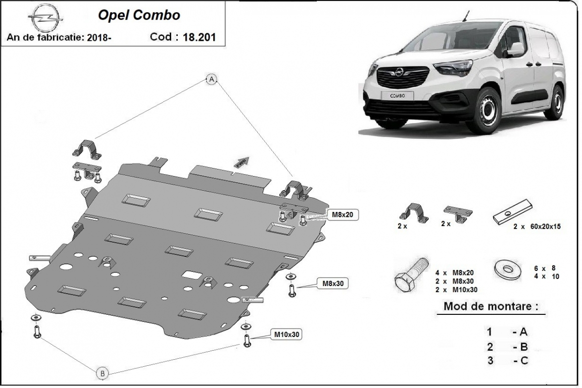 Voor de bescherming van: motor, versnellingsbak, radiator, voorbumper De motor beschermplaat is nieuw en past perfect bij alle versies van Opel Combo geproduceerd tussen 2018 en 2026. Gemaakt van 2 mm dikke Staalplaat. Schroeven, moeren, alle bevestigingsaccessoires zijn inbegrepen. Alle carterbeschermplaten zijn poedergecoat, om corrosie te vermijden. De buitenkant van de carterbeschermplaten heeft staalversterkingen, waardoor de weerstand tegen impact wordt verhoogd. |