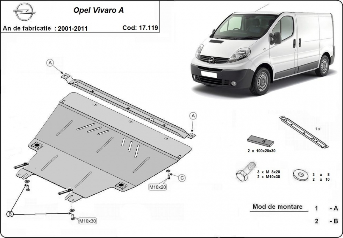 Voor de bescherming van: motor, versnellingsbak, radiator De motor beschermplaat is nieuw en past perfect bij alle versies van Opel Vivaro geproduceerd tussen 2001 en 2011. Gemaakt van 2 mm dikke Staalplaat. Schroeven, moeren, alle bevestigingsaccessoires zijn inbegrepen. Alle carterbeschermplaten zijn poedergecoat, om corrosie te vermijden. De buitenkant van de carterbeschermplaten heeft staalversterkingen, waardoor de weerstand tegen impact wordt verhoogd. |