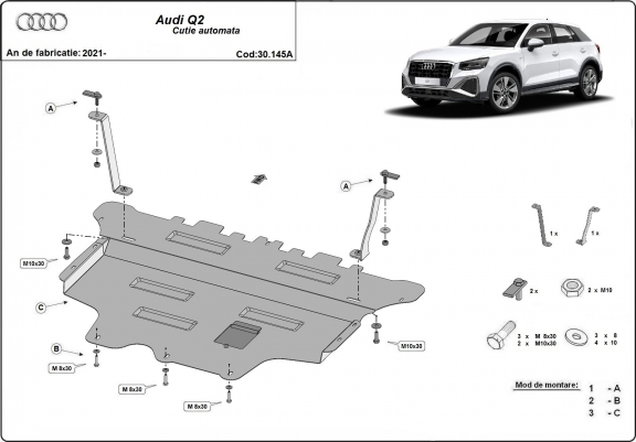 Voor de bescherming van: motor, versnellingsbak, radiator, voorbumper De motor beschermplaat is nieuw en past perfect bij alle versies van Audi Q2 geproduceerd tussen 2021 en 2026. Gemaakt van 2 mm dikke Staalplaat. Schroeven, moeren, alle bevestigingsaccessoires zijn inbegrepen. Alle carterbeschermplaten zijn poedergecoat, om corrosie te vermijden. De buitenkant van de carterbeschermplaten heeft staalversterkingen, waardoor de weerstand tegen impact wordt verhoogd. |