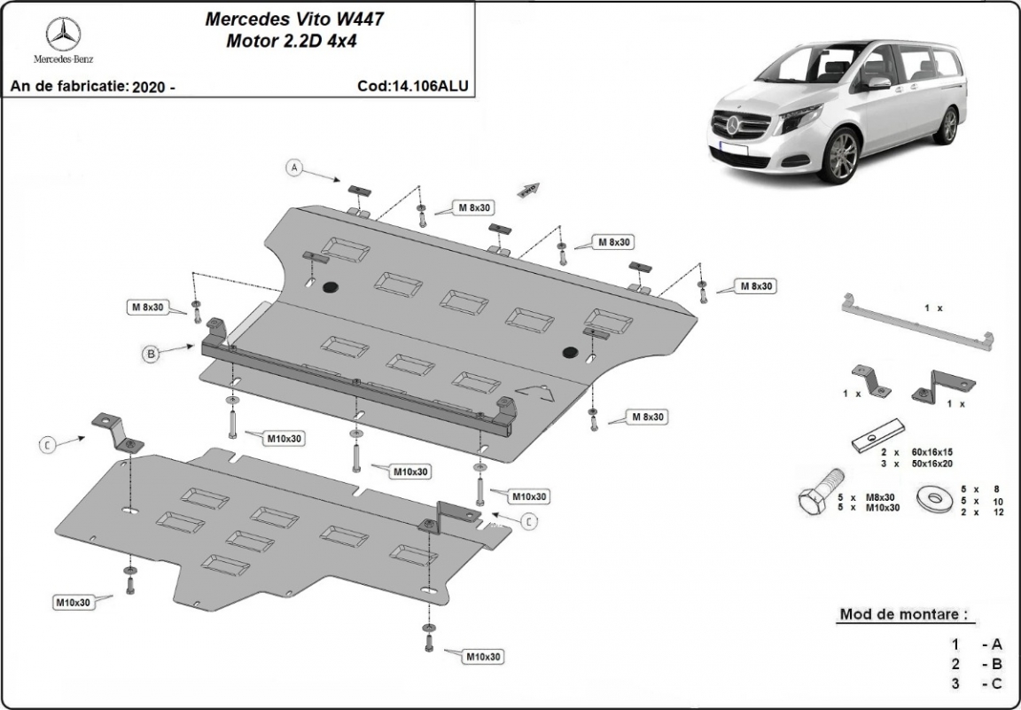 Voor de bescherming van: motor, versnellingsbak, radiator De motor beschermplaat is nieuw en past perfect bij alle versies van Mercedes Vito W447 geproduceerd tussen 2020 en 2026. Gemaakt van 3 mm dikke Aluminiumplaat. De schilden zijn van aluminium, maar de bevestigingssteunen zijn van staal. Schroeven, moeren, alle bevestigingsaccessoires zijn inbegrepen. Alle carterbeschermplaten zijn poedergecoat, om corrosie te vermijden. De buitenkant van de carterbeschermplaten heeft staalversterkingen, waardoor de weerstand tegen impact wordt verhoogd. |