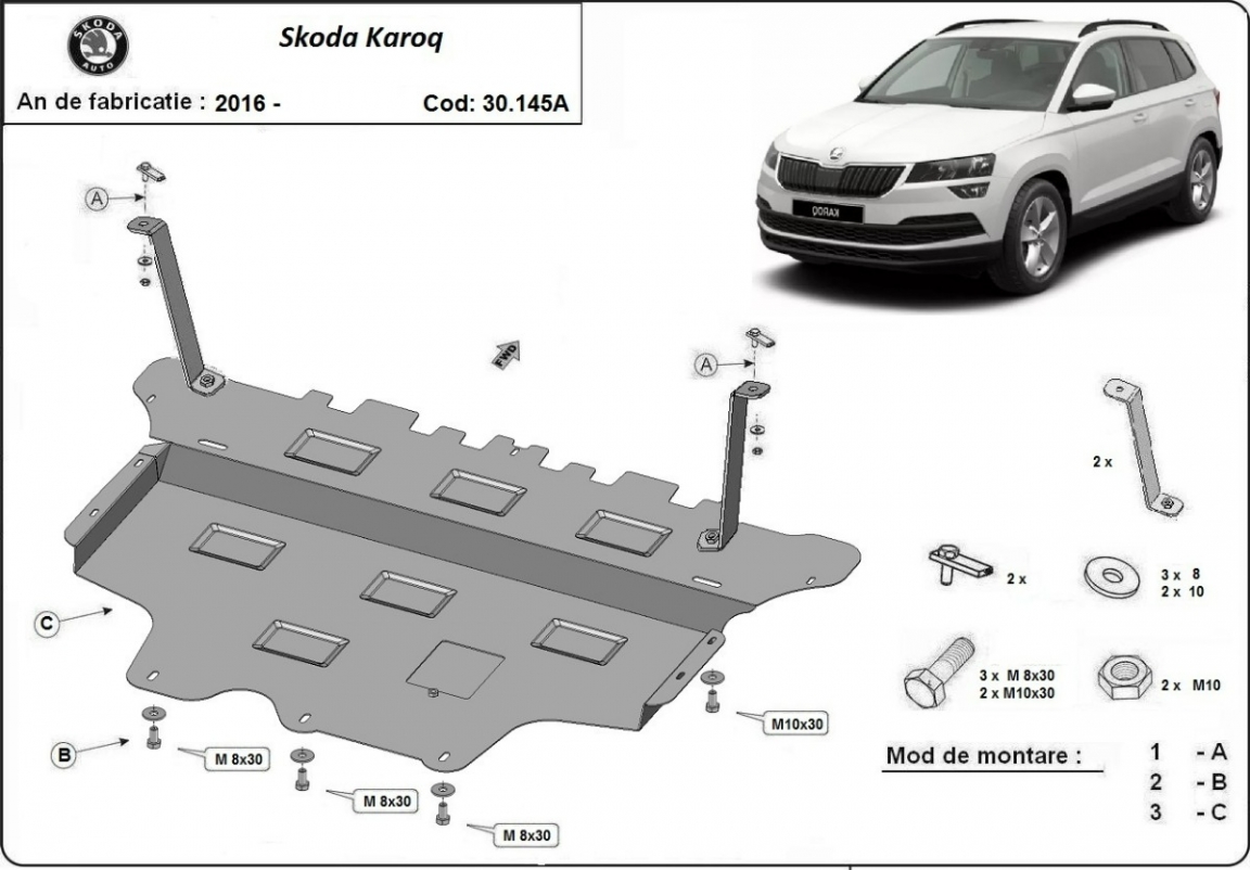 Voor de bescherming van: motor, versnellingsbak, radiator, voorbumper De motor beschermplaat is nieuw en past perfect bij alle versies van Skoda Karoq geproduceerd tussen 2016 en 2026. Gemaakt van 2 mm dikke Staalplaat. Schroeven, moeren, alle bevestigingsaccessoires zijn inbegrepen. Alle carterbeschermplaten zijn poedergecoat, om corrosie te vermijden. De buitenkant van de carterbeschermplaten heeft staalversterkingen, waardoor de weerstand tegen impact wordt verhoogd. |