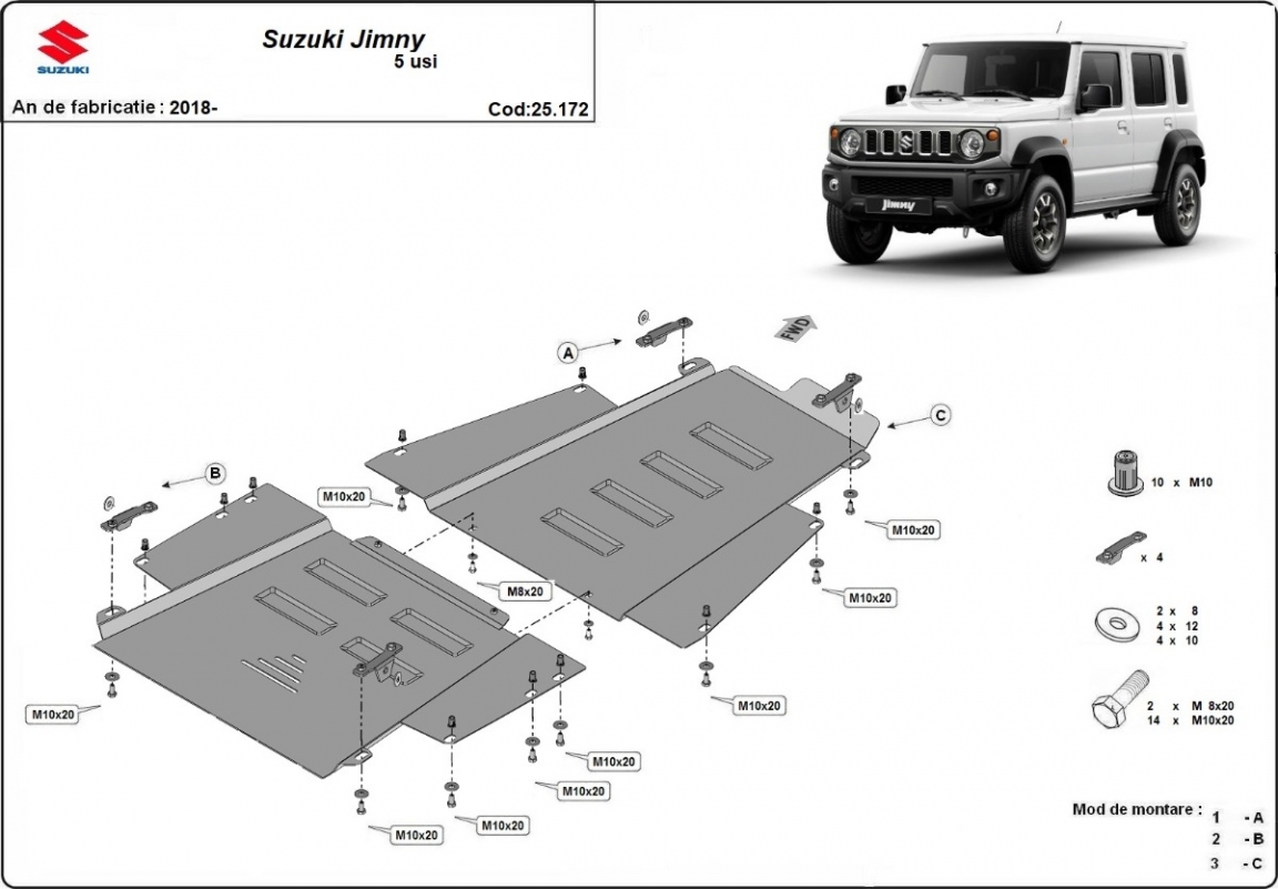 Voor de bescherming van: versnellingsbak, tussenbak De motor beschermplaat is nieuw en past perfect bij alle versies van Suzuki Jimny geproduceerd tussen 2018 en 2026. Gemaakt van 2.5 mm dikke Staalplaat. Schroeven, moeren, alle bevestigingsaccessoires zijn inbegrepen. Alle carterbeschermplaten zijn poedergecoat, om corrosie te vermijden. De buitenkant van de carterbeschermplaten heeft staalversterkingen, waardoor de weerstand tegen impact wordt verhoogd. |